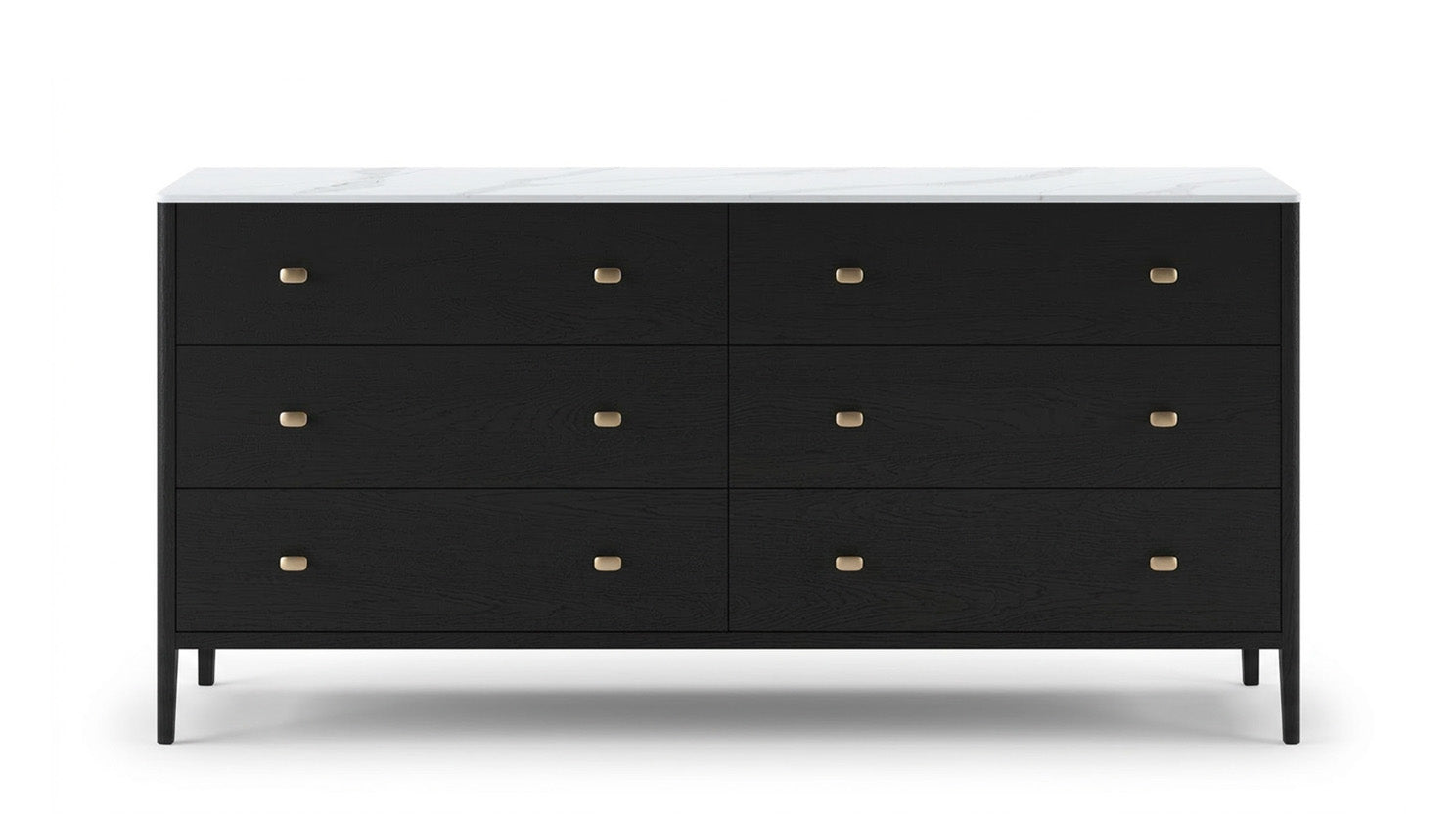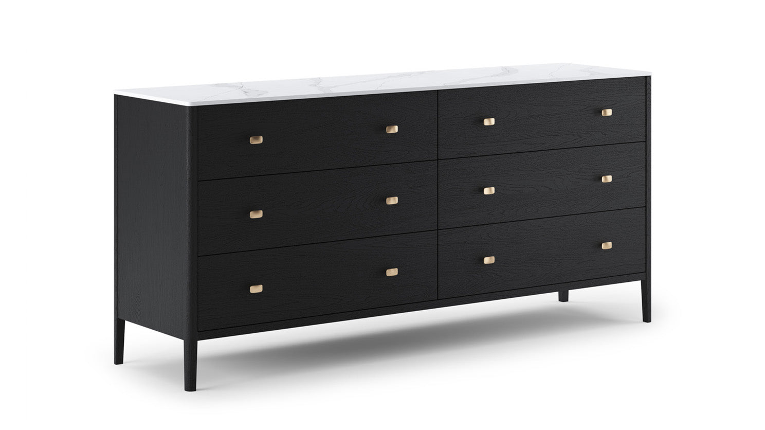 This bedroom collection offers a sophisticated take on modern design with its clean lines and tailored proportions. Smooth drawer fronts are accented by understated hardware, adding a refined touch without disrupting the streamlined look. Elevated legs create a sense of lightness, while open storage elements introduce both function and visual interest. A porcelain top provides a durable, elegant surface, complemented by integrated LED lighting inside the top drawers for added convenience and subtle illumination. Drawers are mounted on soft-close slides, ensuring smooth and quiet operation for everyday use.